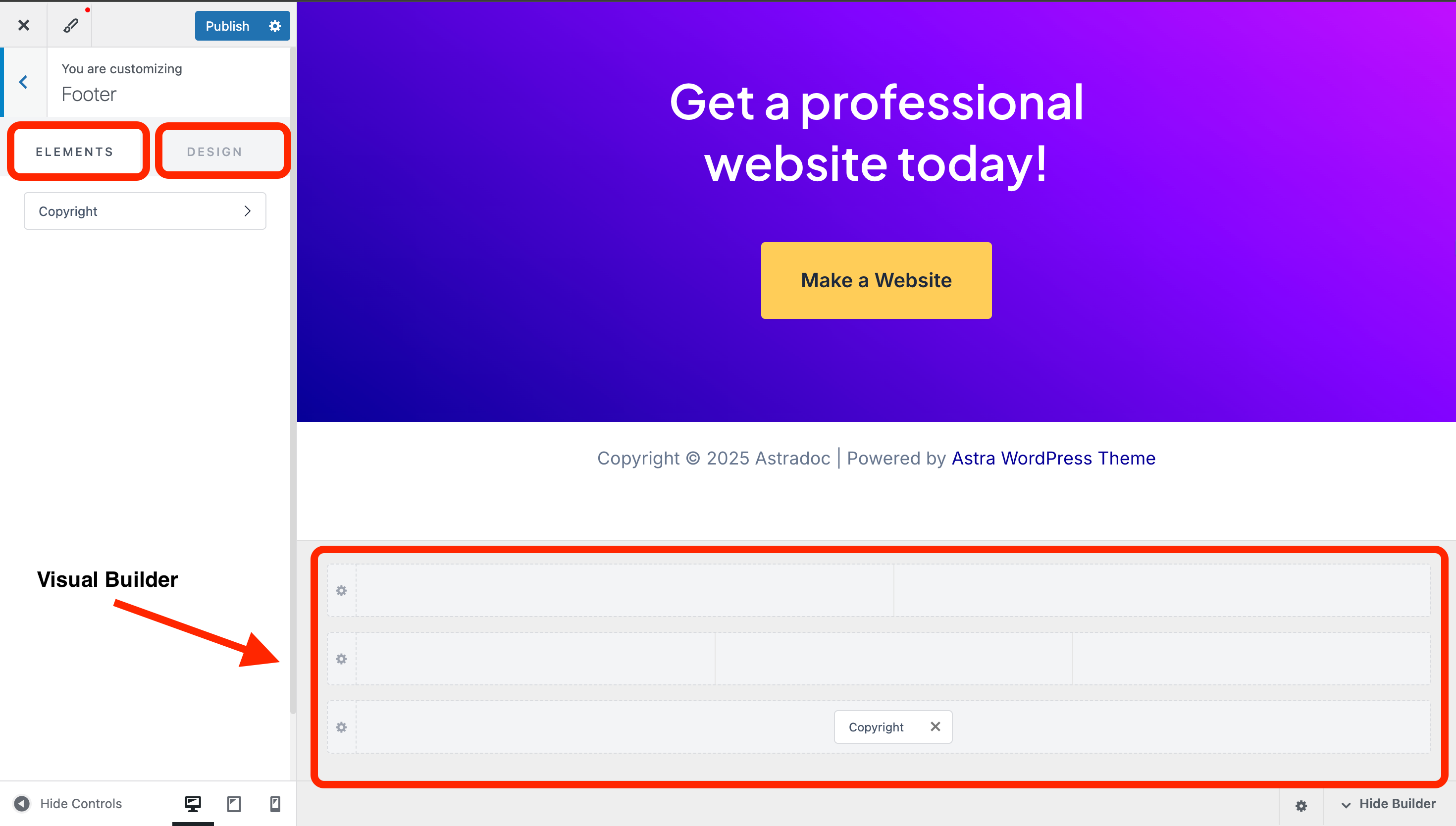 You can add and manage footer elements with Visual Builder and customize them from General and Design tab.