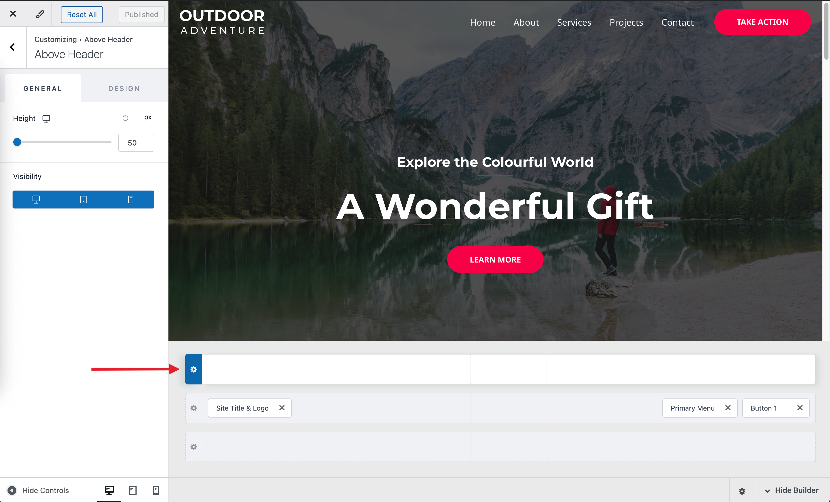 You can add and manage header elements with Visual Builder and customize them from the General and Design tab.