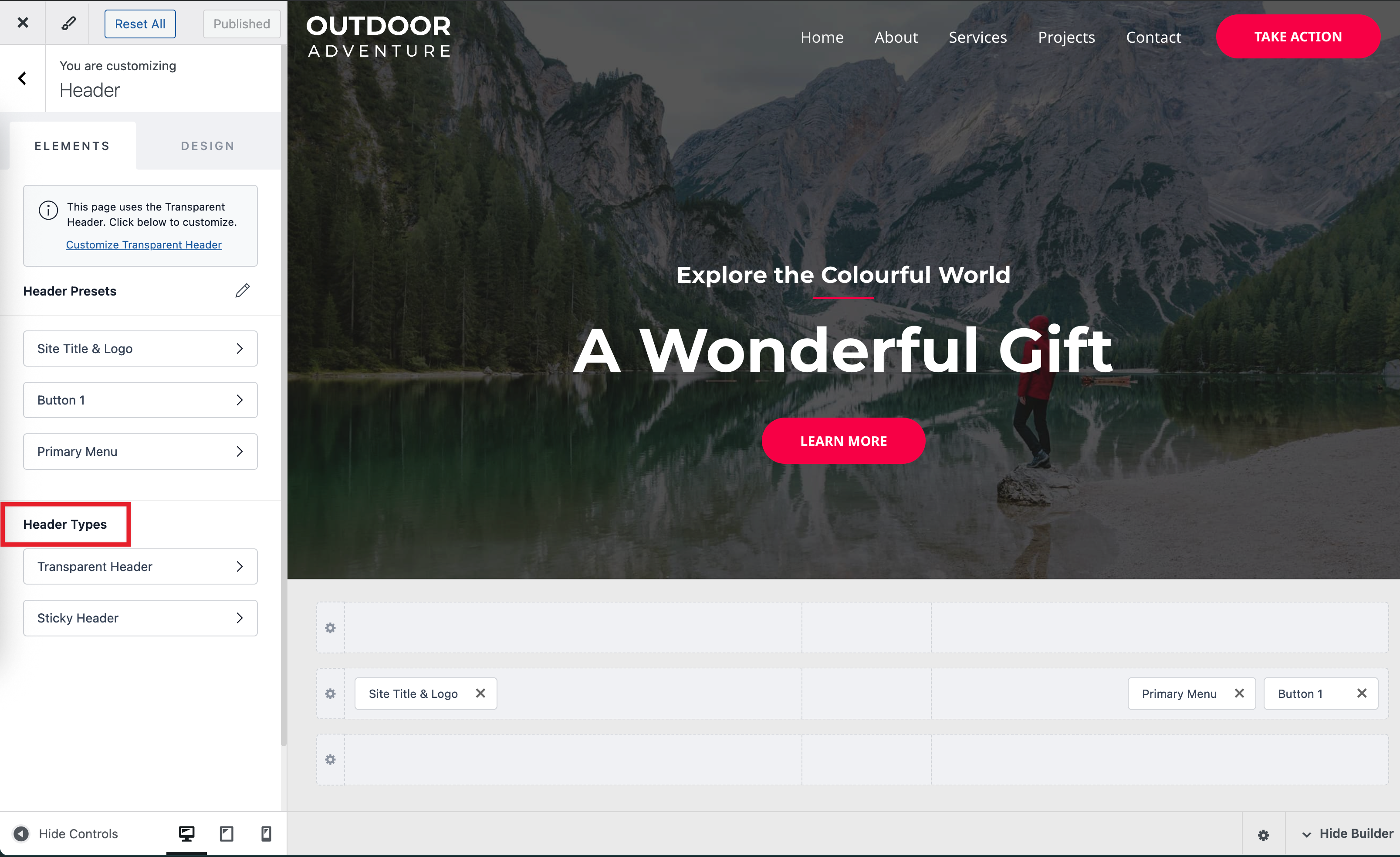• You can click on the plus sign to add different header elements – Button, HTML, Widgets, Social, Primary Menu, Secondary Menu.