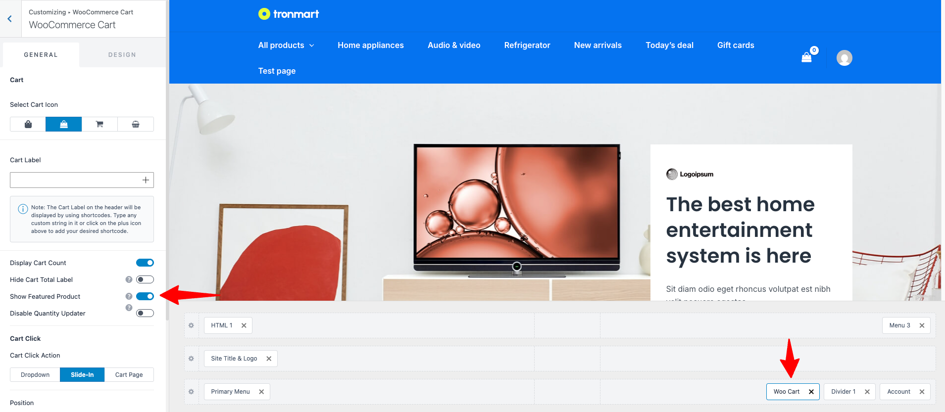 If you have added the Cart to the Primary Header/ Above Header/ Below Header: Clicking on the cart will take you to the WooCommerce Cart Customization settings. Scroll down a bit to enable the ‘Show Featured Product‘ toggle button. By enabling this option, it will show the featured product or if the featured product is not selected then it will show a random product.