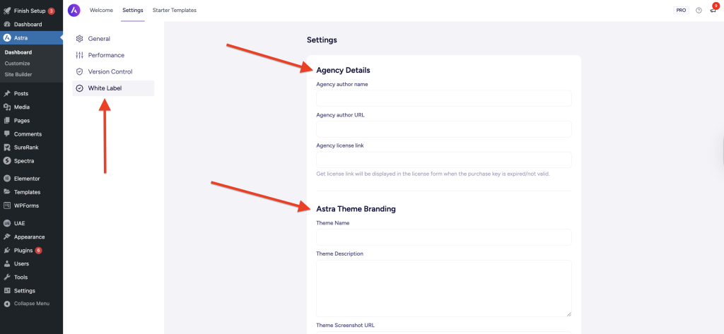 In order to edit the Astra Pro white label settings, you will need to click on the “Astra” option on your WordPress Dashboard, then click the settings option under the White label and add all necessary details in the fields given.