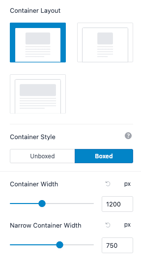 - Container layout and Container Styles: For Boxed and Unboxed style, keep the container layout default or choose from Normal, Narrow, or Full Width.