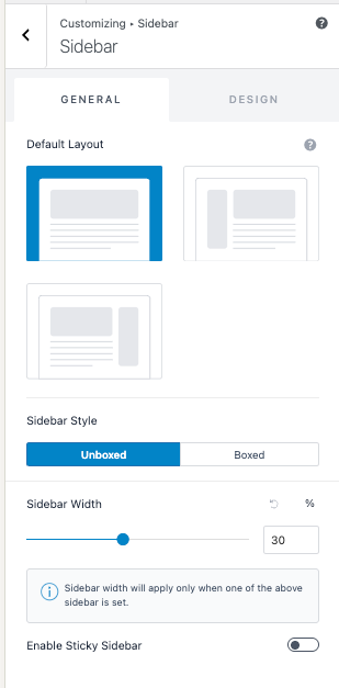 Here, you can select the default layout to Right Sidebar, Left Sidebar, or No Sidebar. This section also allows extra sidebar options such as Sidebar styles, Sidebar width, and Sticky Sidebar.