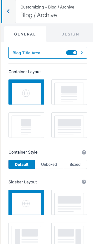 The Blog/Archive section controls the layout for the main Blog and the archive pages, such as Categories, Tags, Author, etc. The Blog/Archive layout includes several customization options along with container and sidebar controls.