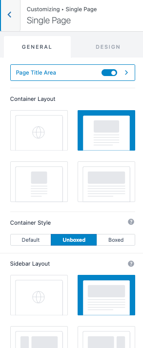 This section is dedicated to the single pages, so you can have specific container and sidebar layout controls for the single pages. The single pages use custom designs for landing pages, about, home page, and contact.