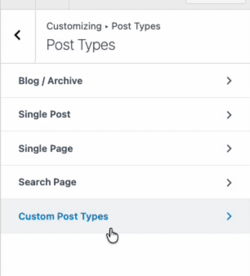 To do so, you can access the settings for a specific post type under Customize >> Post Types.