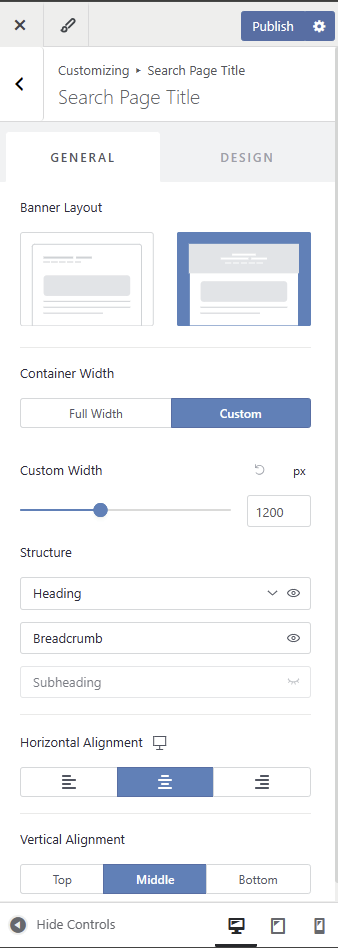 The Search Page Title section controls the banner/title area that appears above your search results — including the layout, heading text, breadcrumbs, alignment, and visual styling. Navigate to Customize → Post Types → Search Page → Search Page Title.